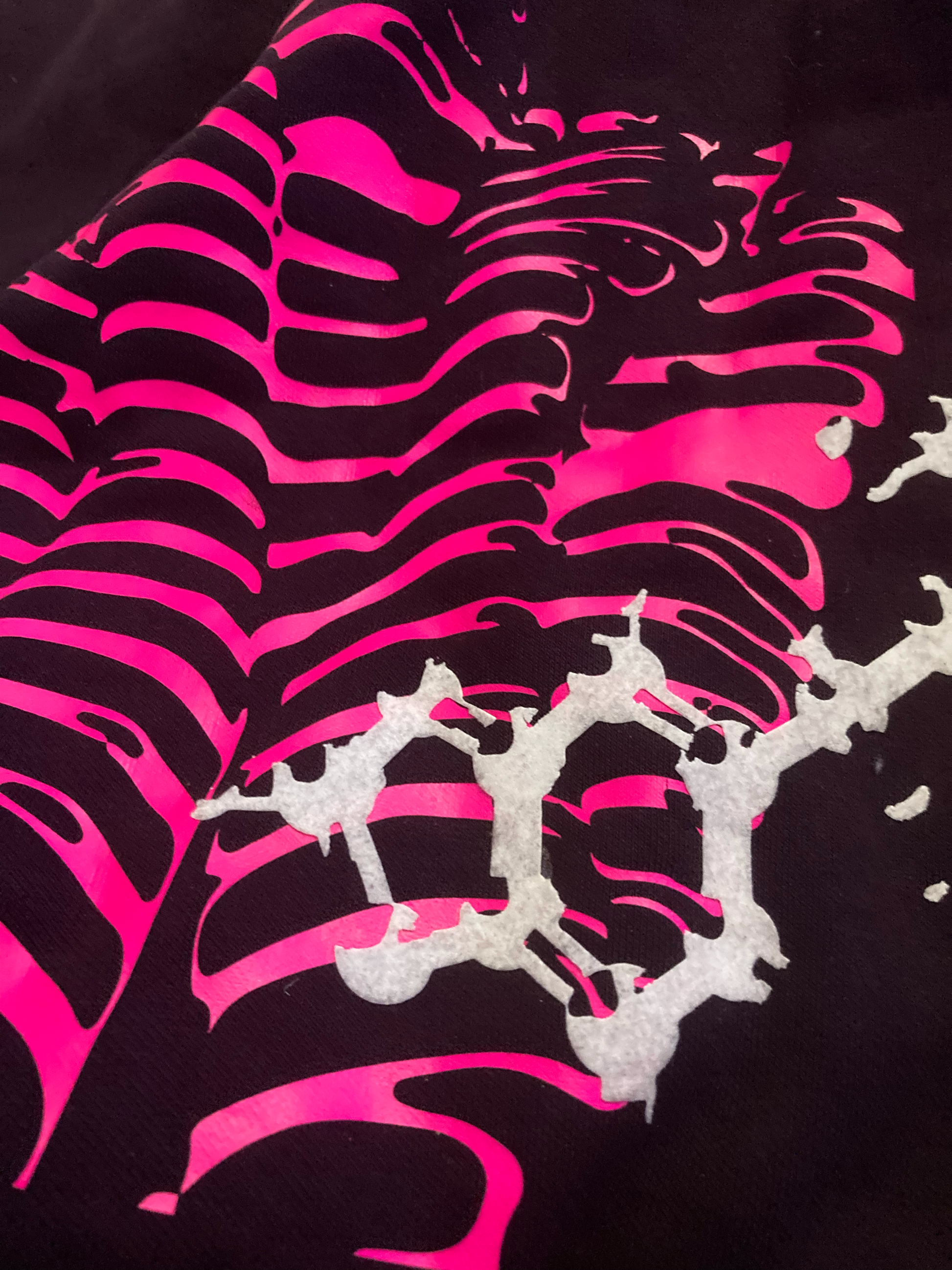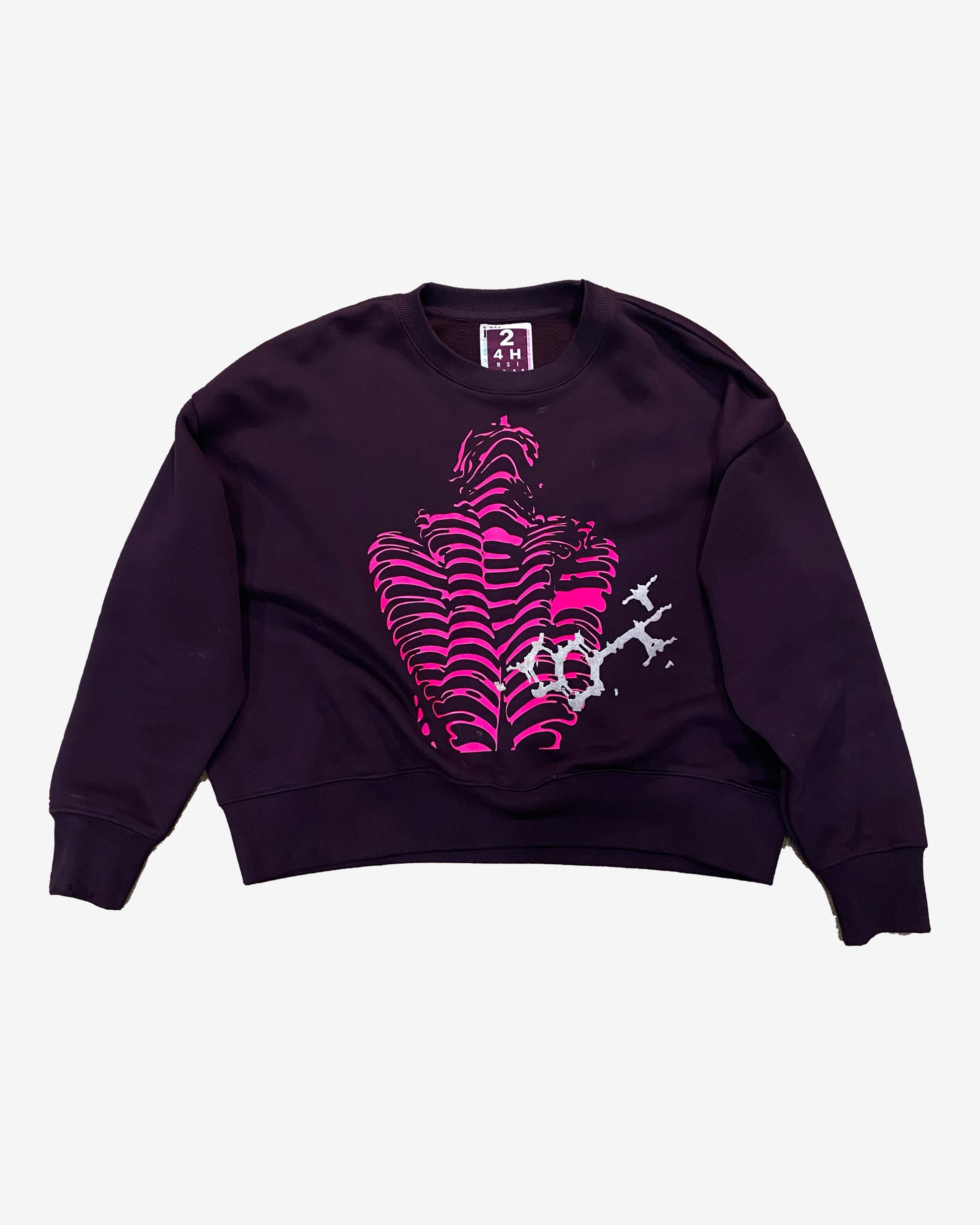 400GSM Fleece Eggplant Crewneck with graphic of humanoid printed in hot pink vinyl overlayed with white felt vinyl. Cropped fit.